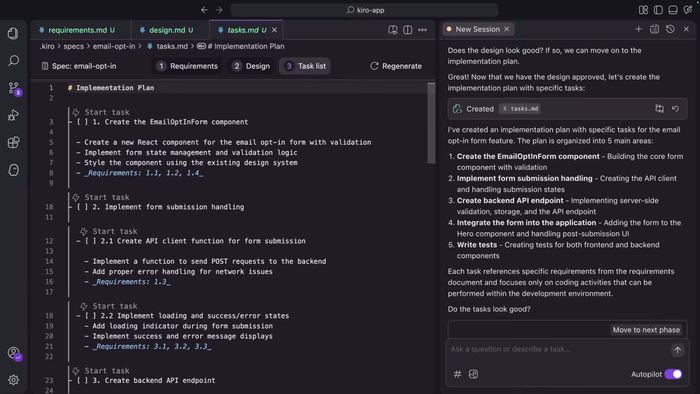 据介绍,与其他拿到提示词就“蒙头写代码”的 AI 不同,Kiro 能与程序员合作,在编写任何代码之前定义需求、系统设计和待实现的任务。
