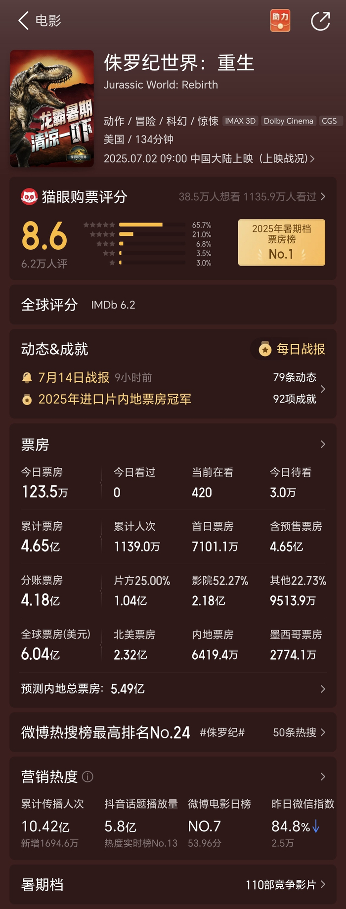 据猫眼专业版数据,《侏罗纪世界:重生》累计票房 4.65 亿元、全球票房 6.04 亿美元。