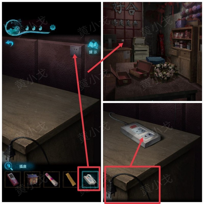 点击五路财神像,用指甲刀剪开插线板胶布,取得插座。
