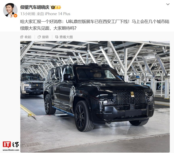 IT之家 7 月 15 日消息,比亚迪仰望销售事业部总经理胡晓庆昨日晚发文透露,U8L 鼎世版展车已在西安工厂下线,马上会在几个城市陆续跟用户先见面。
