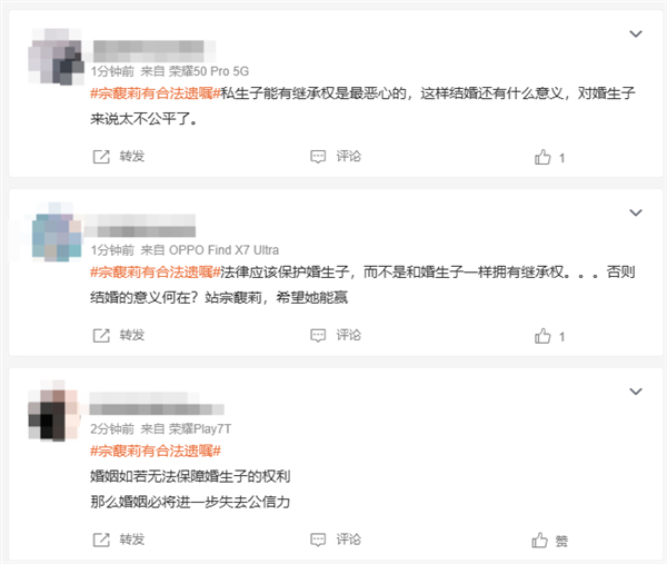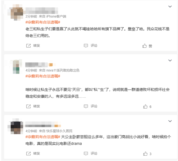 今日,“宗馥莉有合法遗嘱”冲上热搜,大量网友站台宗馥莉这边,并表示“私生子就不该有继承权”“法律应该保护婚生子,而不是和婚生子一样拥有继承权。”