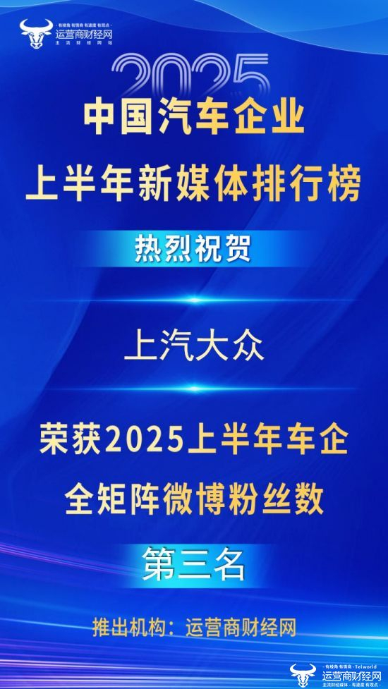 日前,国内知名财经媒体平台——运营商财经网正式发布“2025上半年知名车企全矩阵微博粉丝数前十名”榜单,为业界独一份。其中,上汽大众成功入榜,以880.8万的粉丝数排在第三位!