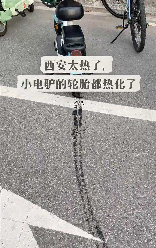 在陕西西安,有网友注意到一台爱玛电动自行车的后轮因为接触滚烫的地面而被热化,在公路上留下了长长的黑色印迹,网友吐槽称,这才是真正的“热熔胎”。