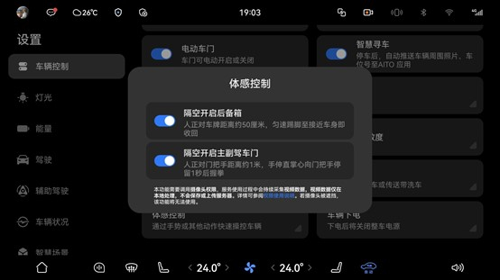 功能打开路径 / 使用方法:中控点击设置 > 车辆控制 > 体感控制 > 点击开启
