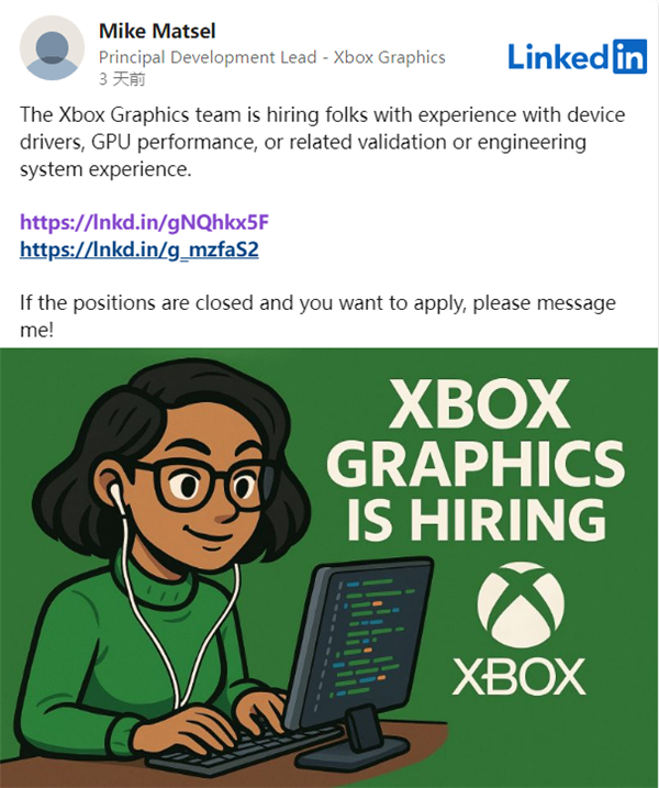 最近,Xbox图形部门的招聘广告在LinkedIn上引发了轩然大波,这张由AI生成的图片显示一名微笑的女性正在电脑上打字,背景是Xbox标志性的绿色,上面写着醒目的“XBOX GRAPHICS IS HIRING”字样。