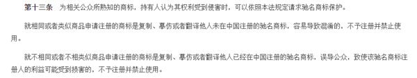 “就相同或者类似商品申请注册的商标是复制、摹仿或者翻译他人未在中国注册的驰名商标,容易导致混淆的,不予注册并禁止使用。就不相同或者不相类似商品申请注册的商标是复制、摹仿或者翻泽他人已经在中国注册的驰名商标,误导公众,致使该驰名商标注册人的利益可能受到损害的,不予注册并禁止使用。”