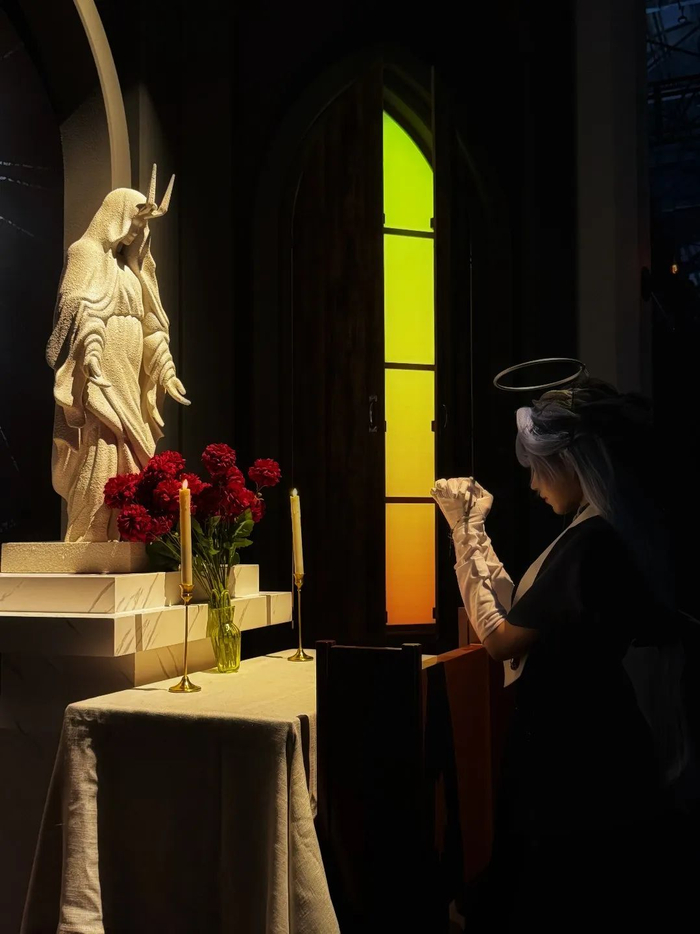 在萨卡兹肉鸽主题区域里,当看到虔诚的萨科塔修女跪在圣像前祈祷时,我不由得放慢了脚步、放低了声音,完全被带进了肃穆的氛围里