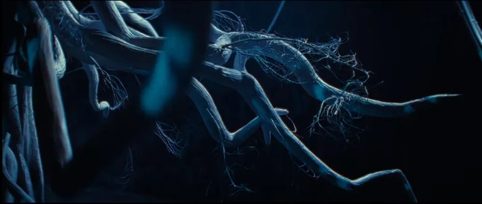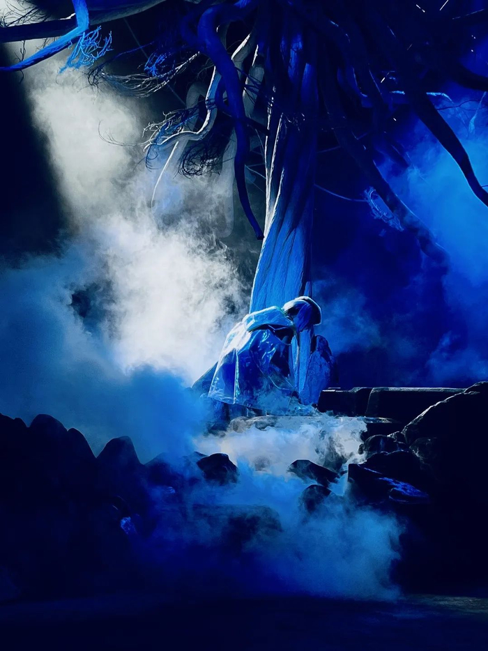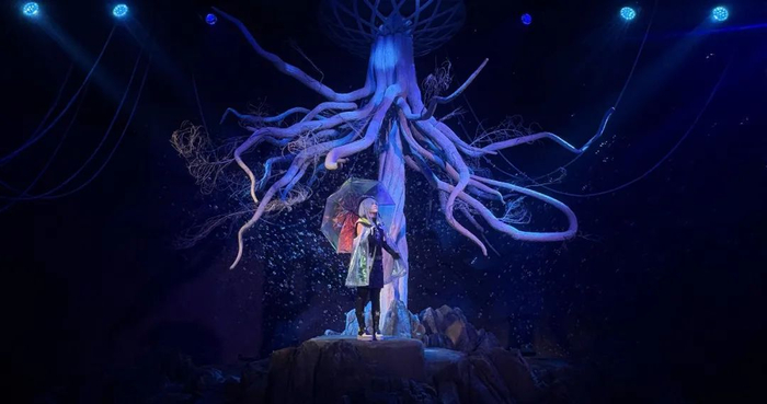 之后走出展馆、回忆这个场景时,我才发现它涉及的要素实在太多了:置景的位置、音视频素材出现的时机、演员的走位和表演、灯光和实景的结合、对注意力和动线的调动......而最吸引眼球的,还是那棵深蓝之树,它大概有六七米高,直抵天花板,表面纹理细腻、枝梢虬结自然,让人好奇究竟是用什么材料制成的。