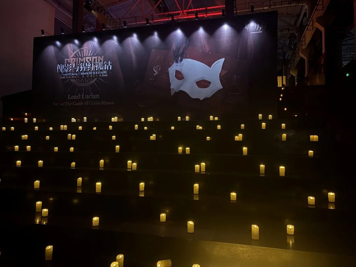 在A馆内傀影肉鸽主题区域的入口通道处,拾级而上的过程,与置景、灯光还有地毯的铺设,一起渲染了前往古堡/地牢的氛围,引得不少人会在这里驻足拍照。而如果没有工作人员的介绍,我几乎忽略了这是段台阶,这场景是由场馆本身的长楼梯装饰而来。