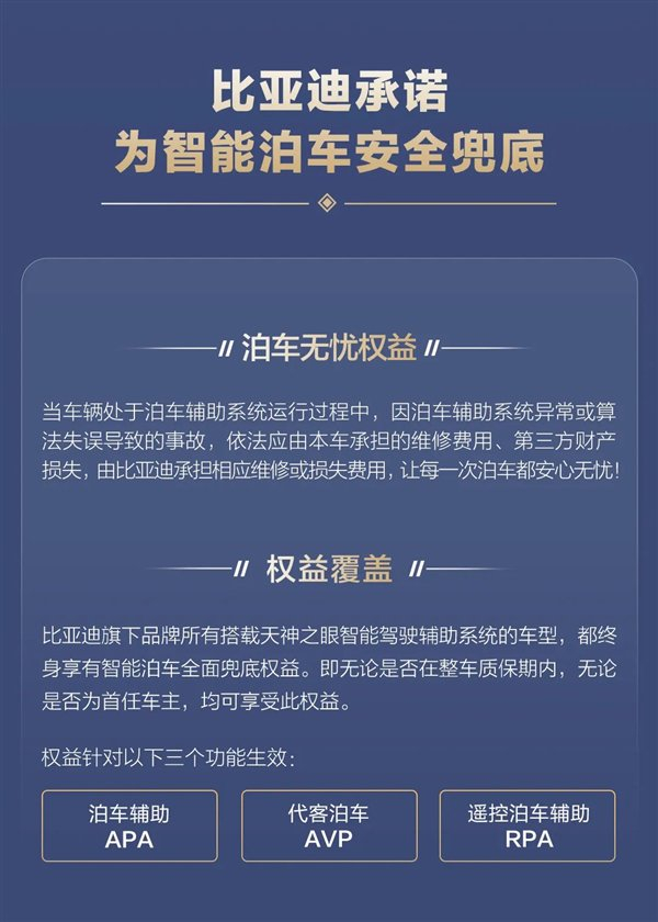 值得关注的是,比亚迪同步推出智能泊车安全兜底权益:因泊车辅助系统异常或算法失误导致的事故损失,无论是否在质保期、是否为首任车主,均可享受终身保障。