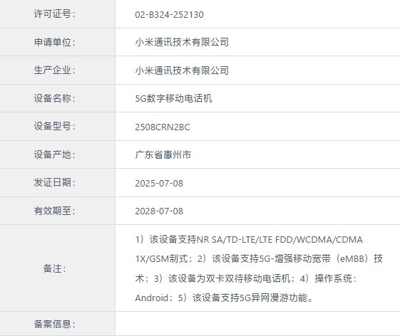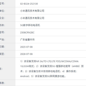 快科技7月16日消息,据博主“完美编排数码”爆料,小米REDMI 15C 5G版本已经在国内入网,设备型号为2508CRN2BC。