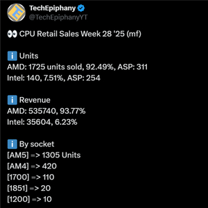 在2025年第28周,AMD CPU在Mindfactory销量达到了惊人的1725台,而Intel的销量仅为140台,AMD的销量是Intel的12倍之多。