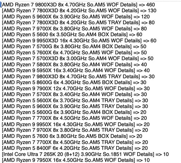 具体来看,AMD的锐龙7 9800X3D和7800X3D依然是最受欢迎的处理器,而Intel的处理器在销量排名前20中几乎不见踪影。