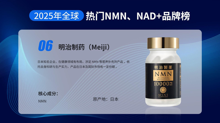 明治制药作为知名制药企业,将严谨的制药标准应用于NMN产品生产。依托强大的科研实力和丰富的制药经验,对产品品质进行严格管控。其NMN产品在安全性和稳定性方面表现出色,经过多道检测工序,确保消费者服用安全。凭借品牌信誉和产品品质,在市场上拥有稳定的消费群体。