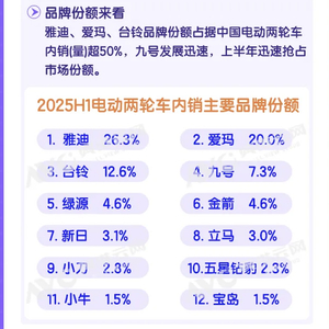 审视品牌增速,新旧势力的发展动能差异更为显著。以九号(同比暴增78.8%)和小牛(增长53.0%)为代表的新兴品牌,凭借对年轻消费群体需求的精准把握和创新的产品体验,实现了远超行业平均水平的狂飙式增长,成为市场最耀眼的“增速明星”。它们正快速抢占年轻化、高端化的细分市场。