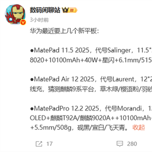 其中,华为MatePad 11.5将搭载麒麟8020芯片,支持星闪技术,采用11.5英寸LCD屏,分辨率2456×1600,支持120Hz刷新率,内置10100mAh电池,支持40W快充。