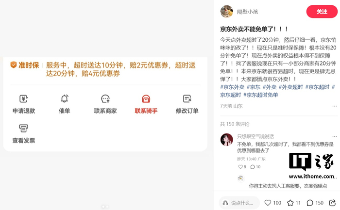IT之家 7 月 16 日消息,社交平台上有多位网友发文称,京东外卖取消了“超时 20 分钟免单”服务,改为了“超时 20 分钟赔付 4 元优惠券”。