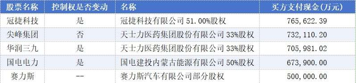 交易价格最高的前5件收并购案件分别为“冠捷科技收购冠捷科技有限公司51.00%股权”“尖峰集团收购天士力医药集团股份有限公司33%股权”“华润三九收购天士力医药集团股份有限公司33%股权”“国电电力收购国电建投内蒙古能源有限公司50%股权”“赛力斯收购赛力斯汽车有限公司部分股权”,交易金额分别为76.5622亿元、73.21亿元、70.60亿元、67.40亿元、50.00亿元。