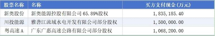 具体来看,新奥股份收购新奥能源控股有限公司65.89%股权,目前已支付183.52亿元;川投能源收购雅砻江流域水电开发有限公司部分股权,目前已支付150.00亿元;粤高速A收购广东广惠高速公路有限公司部分股权,目前已支付106.82亿元。