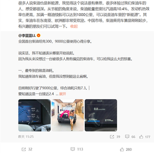 博主称,她没想到的是柴油车竟然这么省油,目前她的车行驶了9000公里,综合油耗只有7.3L/100km。