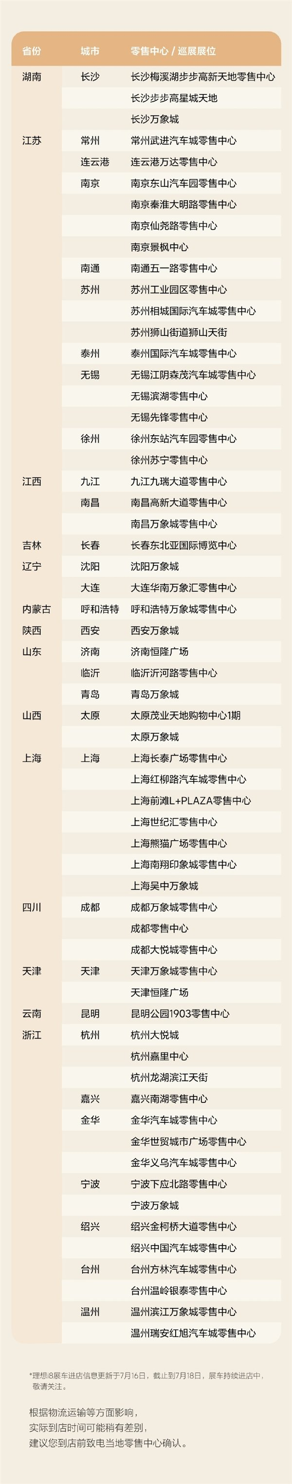 理想i8定位家庭六座纯电SUV,7月17日开启预订,7月18日城市巡展启动,展车陆续进店,7月29日上市发布会,售价预计35万元以上。