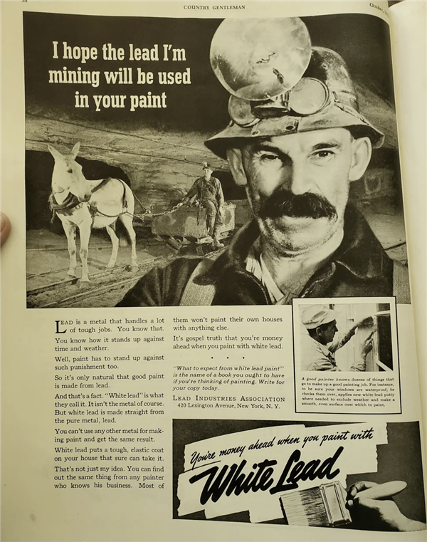 1938年的含铅油漆广告,右下角。当时美国铅工业协会面对媒体报道,压制言论,资助学者论证铅的好处,并用广告鼓励家庭使用白铅油漆进行室内装饰,并声称其“安全可靠”。