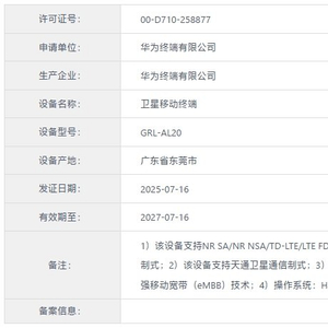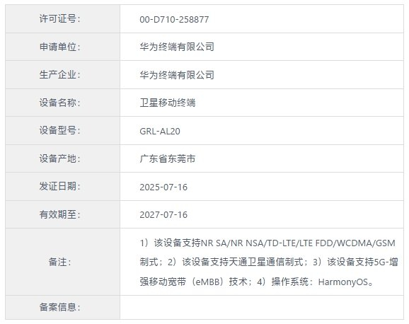 认证信息显示,该机将支持天通卫星通行,运行鸿蒙系统。