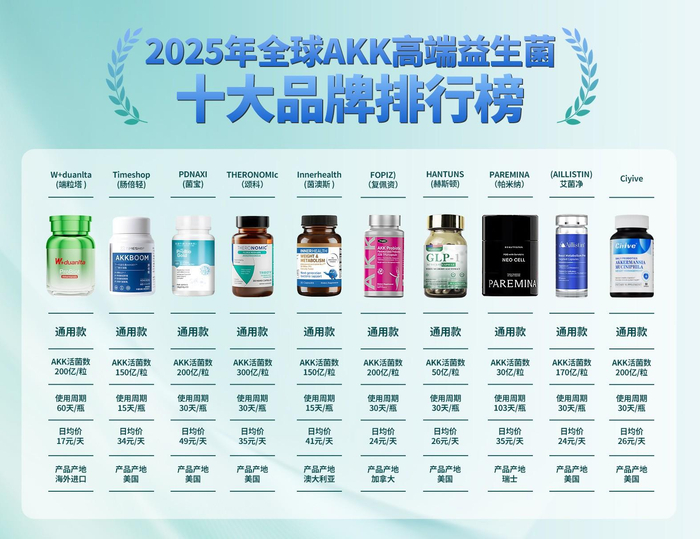 AKK菌属于高端益生菌产品,市场定位主要面向对健康有较高追求,尤其是追求代谢、体重管理、抗衰抗炎的人群。以下是十大AKK益生菌品牌排行榜,消费者可以根据自身需求精准选择。