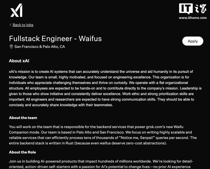 IT之家 7 月 17 日消息,埃隆・马斯克(Elon Musk)旗下的人工智能初创公司 xAI 在其官方网站的职业板块发布了一则颇具极客风格的招聘信息,为其“Waifus”项目招聘全栈工程师。