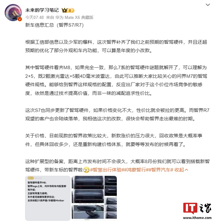 IT之家 7 月 17 日消息,在工信部最新公布的《道路机动车辆生产企业及产品公告》(第 397 批)的车辆变更扩展产品公示清单中,除智界 R7 外,IT之家还发现了鸿蒙智行新款智界 S7 轿车的身影。