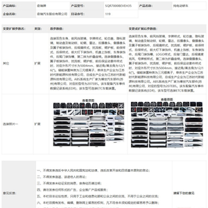 | 其它 | 扩展 | 选装双色车身、前风挡玻璃、字牌样式、轮芯盖、隐私玻璃、制动盘及制动钳、轮辋、雷达、后摄像头、侧摄像头及翼子板装饰件、后视镜样式、扰流板、裙护板、前保样式、后保样式、前大灯下装饰件、机盖上饰板、车身装饰件、后尾门装饰槽、第二排为折叠座椅。选装侧摄像头、翼子板装饰件、扰流板、裙护板、前后保运动套件样式时,对应外形尺寸长为 5004mm,接近角 / 离去角为 12/16 (°)。储能装置种类为三元锂离子,单体生产企业为江苏时代新能源科技有限公司,总成生产企业为江苏时代新能源科技有限公司。ABS 系统生产厂家为博世汽车部件 (苏州) 有限公司,对应的型号为 207EBS。该车配备汽车事件数据记录系统 (EDR),该车型可选装 ETC 车载装置。 | 选装双色车身、前风挡玻璃、字牌样式、轮芯盖、隐私玻璃、制动盘及制动钳、轮辋、雷达、后摄像头、侧摄像头及翼子板装饰件、后视镜样式、扰流板、裙护板、前保样式、后保样式、前大灯下装饰件、机盖上饰板、车身装饰件、后尾门装饰槽、LOGO 样式、后背门雷达、后视镜麦克风、号牌板样式、第二排为折叠座椅。选装侧摄像头、翼子板装饰件、扰流板、裙护板、前后保运动套件样式时,对应外形尺寸长为 5004mm,接近角 / 离去角为 12/16 (°)。储能装置种类为三元锂离子,单体生产企业为江苏时代新能源科技有限公司,总成生产企业为江苏时代新能源科技有限公司。ABS 系统生产厂家为博世汽车部件 (苏州) 有限公司,对应的型号为 207EBS。该车配备汽车事件数据记录系统 (EDR),该车型可选装 ETC 车载装置。 |