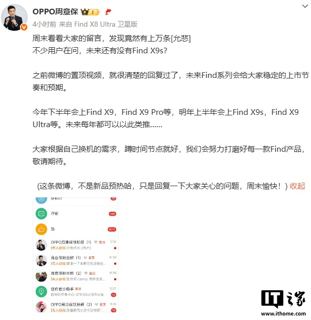 IT 之家注意到,根据 OPPO Find 系列产品负责人周意保此前预热,OPPO 将在今年下半年发布 Find X9 / Pro,明年上半年发布 Find X9s/ X9 Ultra 等,未来每年都可以以此类推。从时间节点来看,OPPO Find X9 系列有望首发下一代影像系统。