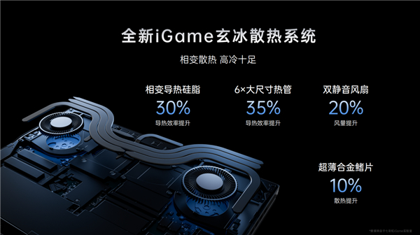采用的全新iGame玄冰散热系统通过相变硅脂导热介质使芯片导热效率提升30%,配合双静音风扇+大尺寸导热管+超薄合金散热鳍片,双烤噪音低至49分贝,整机也实现200W性能释放。