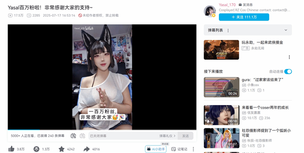 7月17日消息,来自韩国的人气Coser Yasal在B站正式入驻仅短短数日天,粉丝数量便已突破100万。
