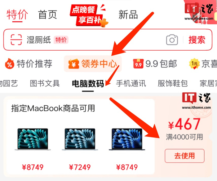点击京东 App 首页领券,电脑数码分类中可领 4000-467 元 MacBook 券。