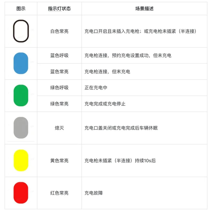 小米 YU7 的充电口指示灯共有 6 种颜色,不同颜色代表不同状态,您可以参考下表了解。