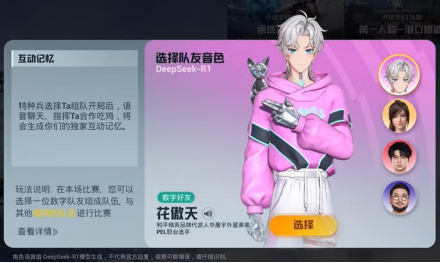 《和平精英》是腾讯首款接入DeepSeek的游戏,走在前面理所应当;同时,今年年初游戏中AI的交互方式还比较基础,以文字问答为主——短短半年时间不到,AI“花傲天”已经进化到“情感陪伴者”的程度,属实也是速度惊人。