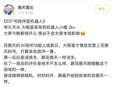 于是最终,“明星人设”赋予了其天然的话题性,长期记忆又使其获得独一无二的成长经历。越来越多玩家积极在社交平台上晒出自己与“花傲天”的交往日常。不仅是AI本身填补了玩家的社交缺口,连相关话题都成为玩家之间新的社交货币。