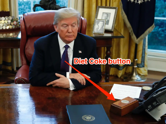 而特朗普对可乐更加成瘾。他在参加国事活动时都忍不住来一罐过瘾,甚至在白宫椭圆形办公室的办公桌上设置了个专用按键,只要他按一下,就会有人端着一瓶冰镇的可乐送进来让他畅饮享受。’’今年1月他再次就职之后,这个可乐按键也时隔四年重新回到了椭圆形办公室。