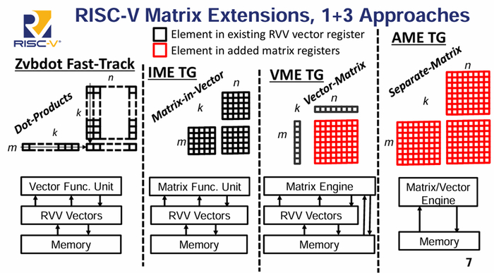 所有的行动,包括适量行动都将极大地利用我们的努力来支持这一点。因此我认为这将需要最长的时间来收敛,但这是RISC-V目前为矩阵扩系所遵循的四条轨道。第一个实际上是更像是一个向量扩展,而一个主要的扩展。所以你可以说有一个快速向量扩展的三个矩阵扩展,这就是现在的解决方案。在RISC-V Intermational我们必须标准化,就标准达成一致。我们还比较确保软件社区知道要瞄准什么。