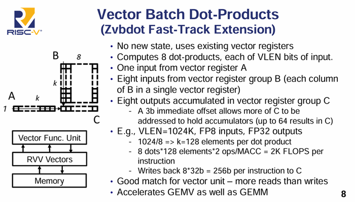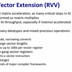 和现在的矩阵功能。有趣的是有时人工智能是其他应用程序的技术组成部分。因此你需要一个能够处理通用计算和人工智能计算的处理器。开发者经常发现的是新型人工智能模型的发展非常快,所以这些模型都可以在旧硬件上进行得相当好,得益于旧硬件具有通用的标量向量矩阵功能,而新模型往往使用这些功能的不同组合。但是如果你的机器是通用的,并且可以支持所有这些,那么它可以很好地运行新模型。另一件事是在同一代模型中不同的用例使用标量、向量、矩阵功能的不同组合来处理该应用程序所需的任何功能。因此风险波的一个重要部分是向量扩展。RVV在几年前批准,它是一个非常强大的矢量扩展。矢量对人工智能非常重要。尽管人们对矩阵计算给予了很多关注,但人工智能中有许多关键步骤是矩阵引擎无法完成的。你需要使用向量来进行计算,RVV旨在支持多种数据类型。
