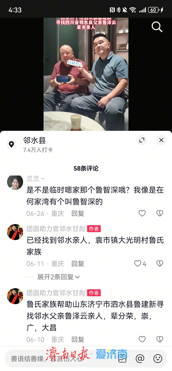 视频发布后的那一夜,鲁建新整夜未眠,在床上翻来覆去,反复翻看视频评论区。“我当时心里全是紧张与期待。”科技的力量在此刻迸发出惊人的效率——仅仅8个小时后,鲁建新的手机响了!电话那头传来了浓重的四川口音:“喂,我是你的堂哥……”