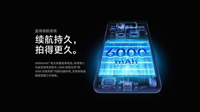 在此基础上,其搭载6000毫安时蓝海电池,加之90W有线与40W无线快充,连续整天拍摄都不用担心。