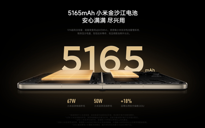 同时,小米MIX Flip 2内置5165mAh小米金沙江电池,含硅量高达10%,并支持67W有线快充和50W无线快充,续航回血双无忧。