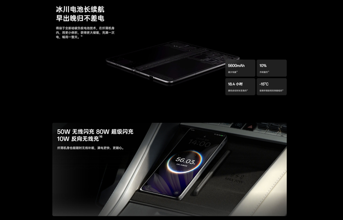 其内置5600mAh超大冰川电池,配合80W超级闪充+50W无线快充,15分钟充至50%,满足全天候续航需求,极寒环境下仍稳定运行。