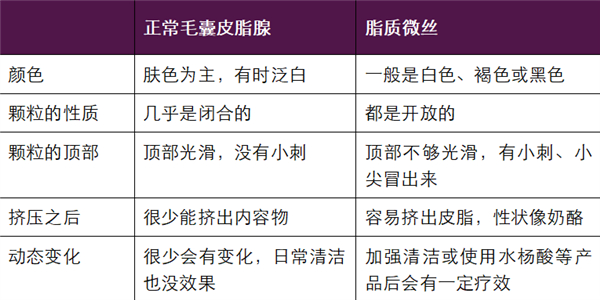 那么,如何确定下巴的小颗粒到底是正常的毛囊皮脂腺还是脂质微丝?我们整理了一个表格,可以直观地帮助到大家。