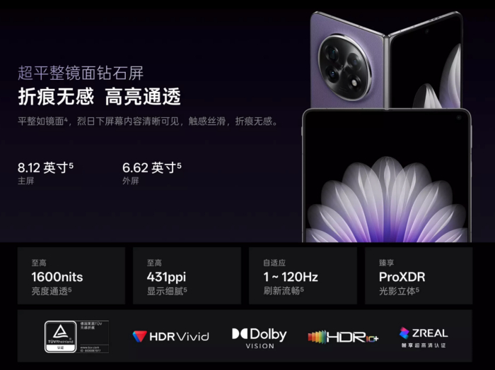 在显示方面,Find N5内外双屏均采用OLED高素质屏幕,外屏6.62英寸,显示细腻,比例更接近传统直板机;内屏则是8.12英寸大尺寸柔性屏,观感沉浸,支持2K分辨率、120Hz LTPO刷新率以及ProXDR光影立体显示技术,峰值亮度高达1600尼特。更重要的是,这块内屏通过莱茵无感折痕认证,让用户在观影、办公、阅读时拥有沉浸级体验。