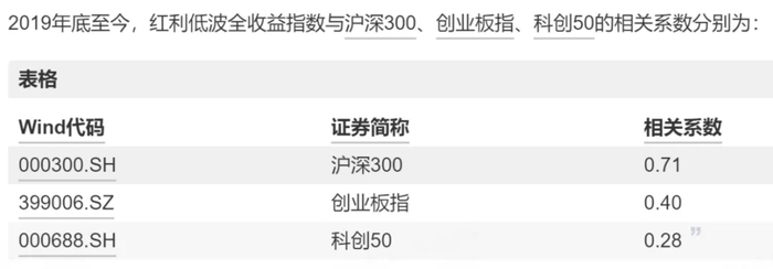 从上面的数据可以看到,红利低波指数与沪深300的相关性较高,而与代表中小盘或成长风格的指数(如创业板指、科创50、北证50)相关性较低。