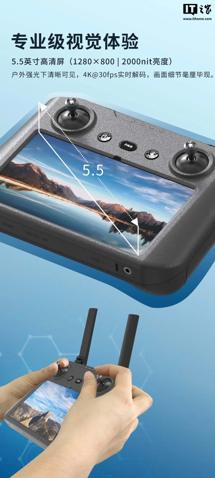 据介绍,这款遥控器配备一块 5.5 英寸 1280 x 800 分辨率面板(亮度至高 2000 尼特,支持 4K 30FPS 无人机图传),遥控器内置 10000 毫安时电池,续航至高 6 小时。