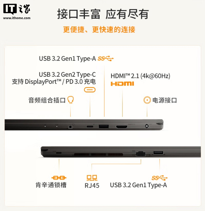 该机搭载 8 核心 16 线程 AMD 锐龙 AI 7 H 350 处理器,配备 16GB DDR5 RAM 和 512GB PCIe SSD,匹配 Wi-Fi 6E 网卡。I/O 方面该机左侧提供 1 个 RJ 45 网口、1 个 USB-A 3.2 Gen 1 接口;右侧提供 1 个 3.5mm 音频接口、1 个 USB-C 3.2 Gen 2 接口、1 个 USB-A 3.2 Gen 1 接口、1 个 HDMI 2.1 接口。